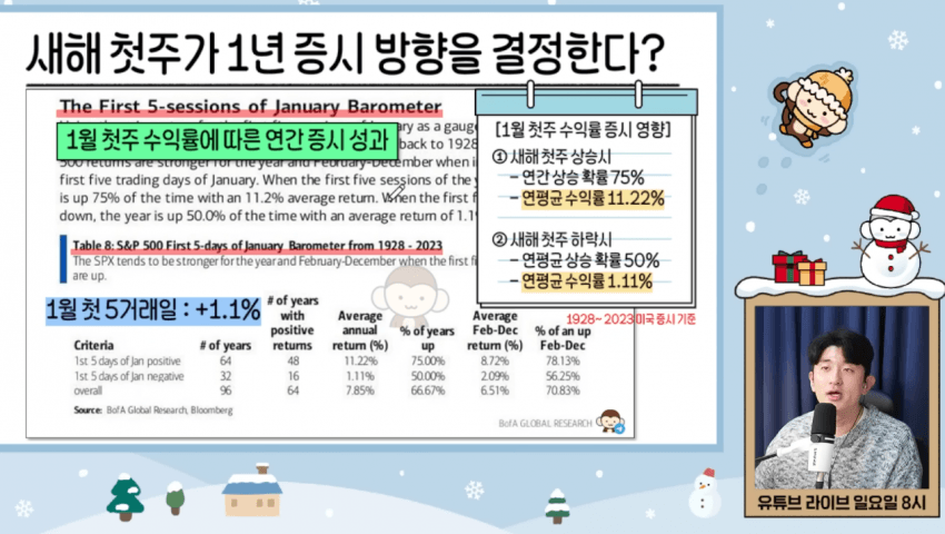 통계적으로 새해 첫 5거래일이 상승하면 한 해 증시가 좋을 확률이 높은데, 올해 1월 초 증시는 긍정적으로 시작했습니다.