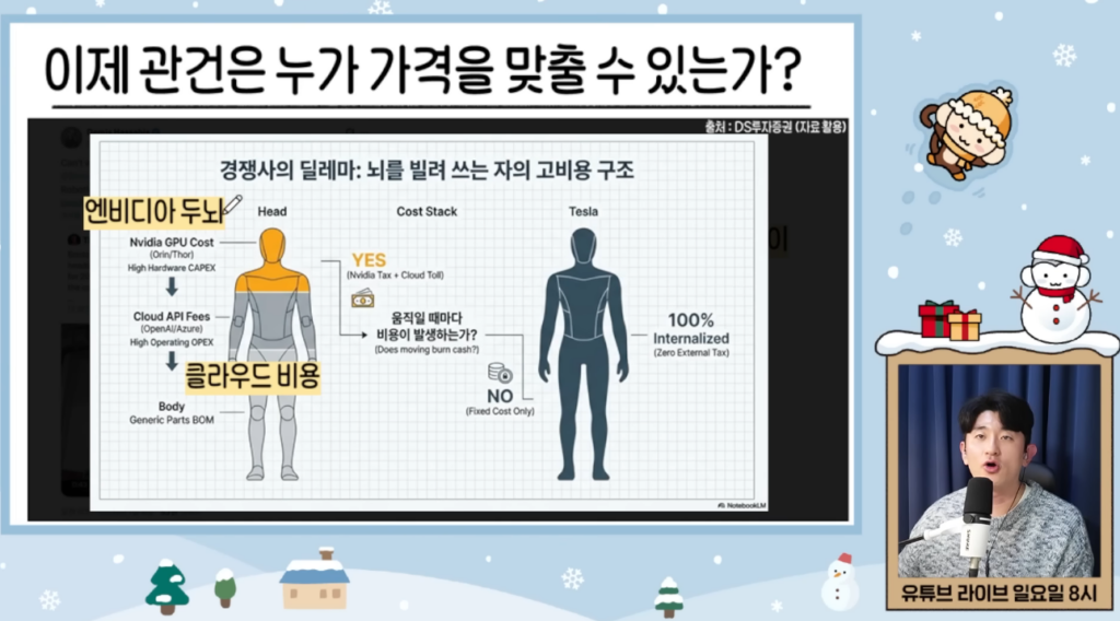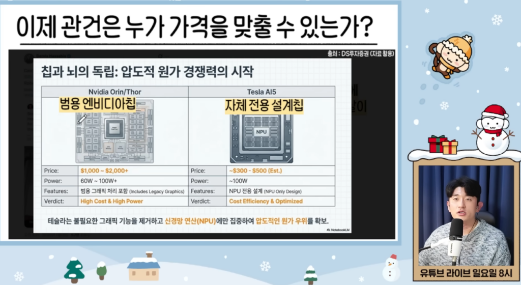 타사는 엔비디아 칩과 클라우드 비용(엔비디아 세금)을 지불해야 하지만, 테슬라는 칩부터 공장 설계까지 수직 계열화를 이뤄 유일하게 가격 경쟁력을 갖출 수 있다는 분석이 제기되었습니다.