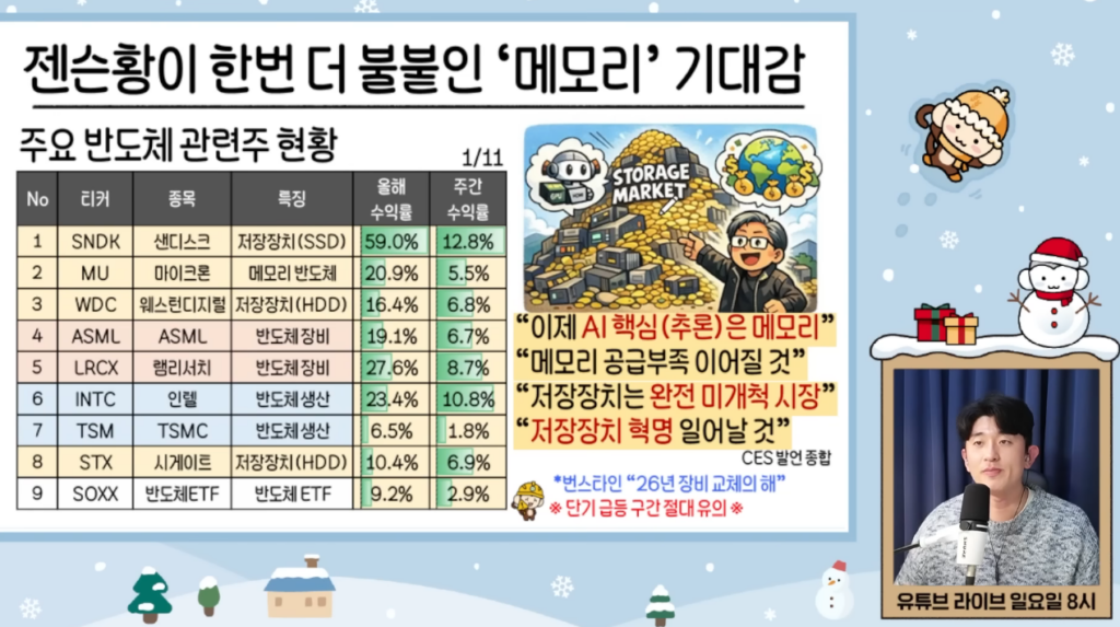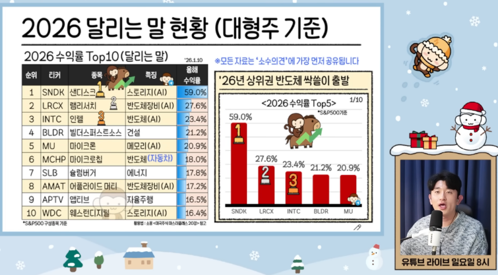 올해 수익률 상위권을 메모리 반도체(삼성전자, SK하이닉스, 마이크론, 웨스턴디지털 등)가 휩쓸고 있습니다. 2026년 수익률 Top 10 중 약 7개가 반도체 저장장치 및 장비 관련주다.