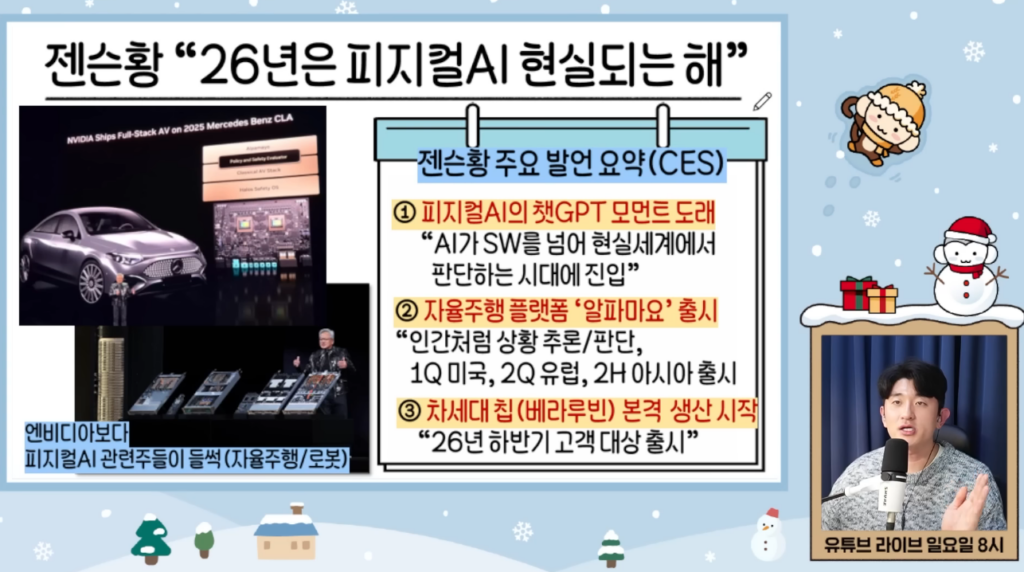 1. 2026년은 AI가 가상 세계를 넘어 현실 세계(자동차, 로봇)로 진출하는 ‘피지컬 AI’의 원년이며, 이로 인해 자율주행과 로봇 섹터가 주도주로 부상할 것으로 보임.