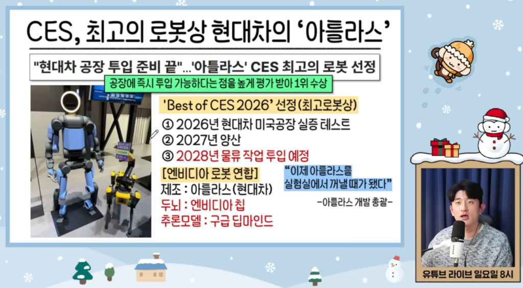 현대차(보스턴 다이나믹스)의 ‘아틀라스’가 공장 즉시 투입 가능성을 인정받아 CES 최고 로봇상을 수상했습니다. 실용성이 핵심 화두입니다.